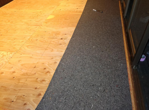 床下補強の後は、新規断熱材を入れたうえで新しい床を施工し、 その上からグリッパー・フェルト・絨毯の順に仕上げを行いました。